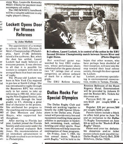 "The Chicago Lions RFC had quite a bit of influence in Midwest rugby at that time and convinced the Midwest Referees’ Society not to support the Women’s Nationals that year. Thankfully we were rescued by the East and West Referees’ Societies. In fact a number of referees really stepped up to help us."(Mary Larkin, Chicago WRFC)